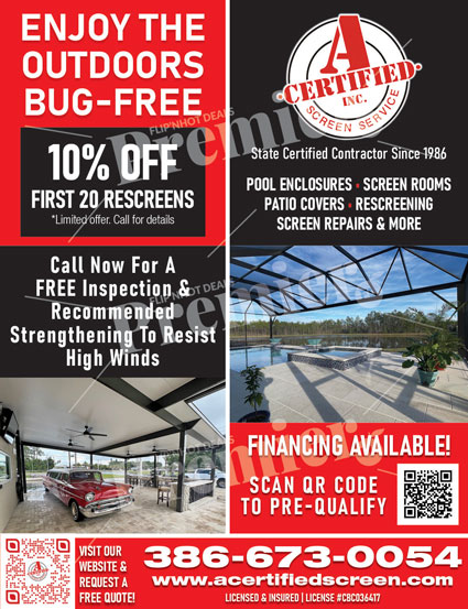 A Certified Screens Inc. has been serving Florida homeowners since 1986, offering high-quality pool enclosures, screen rooms, patio covers, and screen repairs. Their experienced “A Team” is known for craftsmanship, professionalism, and customer care.