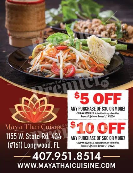 Maya Thai Cuisine is a locally loved Thai restaurant in Longwood, Florida, offering authentic Thai flavors in a relaxed and welcoming setting. Known for its fresh ingredients, aromatic spices, and beautifully balanced dishes, Maya Thai is a favorite for diners who appreciate traditional recipes prepared with care. Whether you’re new to Thai food or a longtime fan, the restaurant delivers a consistently satisfying experience.
