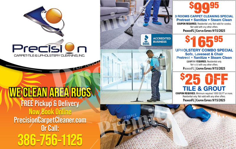 Precision Carpet Cleaning specializes in restoring the beauty of your home with expert carpet, tile, and upholstery cleaning services. Family owned and BBB accredited, they’ve built a trusted reputation throughout Volusia County for quality, care, and professionalism.