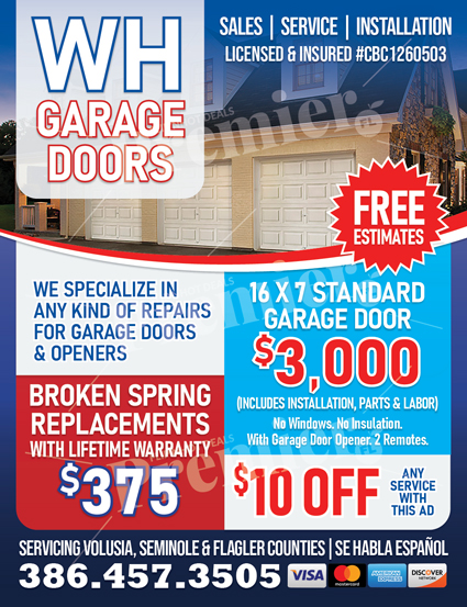Serving Volusia, Seminole, and Flagler Counties, WH Garage Doors is known for fair pricing, honest service, and quick response times. They also offer free estimates and bilingual service.
